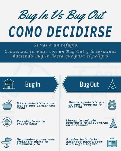 Una de las decisiones más importantes que tomarás cuando lidies con una emergencia es si hacer bug in o bug out, basicamente la primera se refiere a refugiarse en su propia casa hasta que pase el peligro. Bug out significa que tiene que salir de su casa, generalmente para poner cierta distancia entre uno mismo o su familia y la amenaza. Siempre es una buena idea consultar a las autoridades antes de tomar una decisión si tiene tiempo para hacerlo.